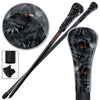 The top is constructed of acrylic with carved zombie creeper scene inside. The black stainless steel shaft houses a stainless steel blade to defend you in case of emergencies. Zombie Killer is screen printed on the black anodized blade.  Darkened aluminum fitting disguise the opening for the blade. At the bottom is a rubber stopper for balance and comfortable walking.
