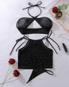 • Featuring a cross halter bra with starry hollow details, a matching panty, and a playful mesh skirt, this trio brings sparkle to every sultry moment.