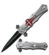 Two Tone Red and Silver Crusaders Aluminum Spring Assisted Opening Pocket Knife has a distinct look that has both Medieval and Gothic appeal. It features a 4 inch two-tone stainless steel blade and is assisted opening for easy deployment. The aluminum handle features a cross medallion set on a background. It has a pocket clip for convenient carry.