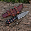 This beautiful everyday carry fixed blade skinner knife feels great in your hand and is suitable for field dressing, Butchering Game, Outdoor Survival, Camping, and any smaller cutting task. Great multipurpose tool for indoors or outdoors. Our high-end Damascus steel custom handmade well-balanced hunting dagger knife is hand-forged Damascus steel; pattern-welded in-house combining 1095 tool steel and 15N20 nickel tool steel. The hardness of this Damascus blade is rated at 55 to 58 HRC on the Rockwell scale which holds the sharpness for a long time. This hand-ground blade has heft and comfortable handling made for practical use. The entire knife is handmade at our facility from forging the Damascus billet to stitching the custom-fitted quality leather sheath with belt loop for easy fastening.