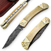 Included with this knife is a leather sheath that has been hand sewn and tooled with a basket weave design. It features a belt loop to slide your knife on your belt and keep it with you at all times. Then you have the handle that has constructed of real bone that has been smoothed and carved with brass accents. Intricate file work on the spine that leads to the lock back release, just push it down the release to close your blade. The blade comes in a clip point style with a nail notch to access your blade easier.