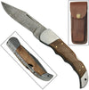 This hand crafted custom Damascus steel knife was fire forged with high grades of steel folded over and over again to produce the blade's distinctive look as well as a forceful and powerful edge. The blade temper is around 54 to 55 with 176 layers and the folding amount 300-350 times. The blade is drop point style and features a nail mark for opening the blade. The carved wood handle is contoured for a firm yet comfortable grip. Brass pins adorn the handle holding the piece together with stainless steel bolsters. Running along the spine of the knife is a lock back mechanism for releasing the blade. This beautiful piece also comes with a brown leather tooled sheath with snap to protect your blade and to keep at your side for when you need it.