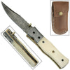 Reminiscent of the Old West we give you the American West Liner Lock Damascus Steel Hand Forged Pocket Knife. This hand crafted custom Damascus steel knife was fire forged with high grades of steel folded over and over again to produce the blade's distinctive look as well as a forceful and powerful edge. All Damascus blades are instantly recognizable by their contours that resemble a multitude of different patterns from the geometric to the flowing water designs. The blade temper is around 54 to 55 with 176 layers and the folding amount 300-350 times. The blade is clip point style and features an ambidextrous thumb stud for opening the knife. The carved bone handle is contoured for a firm yet comfortable grip. Brass liners and spacer adorn the handle with a mosaic pin and Damascus steel bolster. This beautiful piece also comes with a brown leather tooled sheath with snap to protect your blade and to keep at your side for when you need it.
