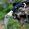 Our high-end folding blades are hand-forged Damascus steel; pattern-welded in-house combining 1095 tool steel and 15N20 nickel tool steel. The hardness of this Damascus blade is rated at 55 to 58 HRC on the Rockwell scale which holds the sharpness for a long time. This hand-ground blade has heft and comfortable handling made for practical use. This folder has days of work put into it and its entirely handmade with solid brass frame. It has a front liner locking mechanism.