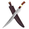 Full Tang Construction Blade Material: Damascus Steel Handle Material: Wood, Camel Bone Overall Length: 22 inches, Handle Length: 6.25 inches Genuine Bovine Leather Sheath Included