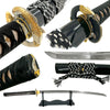 Experience the serene beauty and elegance of the Dance of the Koi 1060 Damascus Steel Handmade Katana. This exceptional sword is meticulously crafted with a blade forged from high-quality 1060 carbon steel, expertly folded to reveal a stunning Damascus pattern alongside a unique natural hamon that sets each piece apart. The blade is finely sharpened and honed to a razor's edge, ensuring optimal performance. Fitted with a stunning brass guard depicting an intricate scene of two koi fish dancing in harmony, this katana showcases a captivating design that embodies grace and fluidity. The handle is wrapped in a stylish black cord over authentic ray skin, providing a comfortable grip for wielding. At the top, a striking black metal end cap features a beautifully detailed koi, adding a unique touch to this masterpiece. Housed in a sleek black lacquer-finished hard scabbard, this katana is as much a work of art as it is a functional weapon. Each purchase comes with a wooden silk-lined gift box, a display stand, a cotton bag for storage, a cleaning kit, and a certificate of authenticity, making it an ideal gift for collectors and martial artists alike. With an overall length of 42 inches, a blade measuring 28 inches, and an 11.5-inch handle, the Dance of the Koi katana embodies the spirit of the warrior.