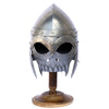 This helmet will give any warrior a fearsome aspect as he faces down the most deadly foes. The helm offers good coverage with its full cheek pieces and lower extension that terminate in raised teeth. Adjustable liner with chin strap, 18 gauge steel.