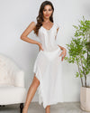 Deep V-neck Pleated Lace Side Slit Mesh Dress