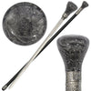 It featured a resin handle with a resin web feet with claws followed by three demon face with ear wings. The Demon Face Web Feet sword cane features a 15.5 inch dagger style non sharp blade that slides into a black aluminum shaft. The cap and tip of the shaft carries a beautiful vine design with a rubberized tip for balancing when walking.