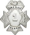 This badge is custom engraved; the text shown is for example only. The center disk, finish, attachment and curve of the badge must also be selected.