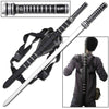 Additionally, this sword includes a genuine wooden scabbard. It is fully wrapped in black with polished metal rings. Unique characteristic #3: flat back support with thick nylon straps. The 6 inch wide back support is hard with a foam padded back to ensure comfort. This sword can be placed on the back with arms through the straps to support it. A center strap goes across the front.