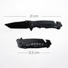The Fire and Steel - Onyx Tanto Black Folding Knife is a sleek and reliable tool designed for versatility and everyday use. With an overall length of 21 cm when open and 12.5 cm when closed, it features a sharp 9 cm stainless steel blade with a distinctive tanto-style tip for precision cutting. The durable aluminum handle is equipped with a seat belt cutter, a window breaker, and a metal belt clip for secure carrying. Combining functionality with a modern black finish, this folding knife is perfect for outdoor adventures, work, or emergencies.