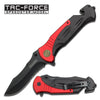 Tac Force Large Rescue Linerlock. 6 1/4" closed. 4 3/8" black coated high carbon stainless, assisted opening, partially serrated blade with dual thumb studs. Two tone anodized aluminum handles with logo inlay shield. Integrated seat belt cutter and glass breaker. Black stainless pocket clip with drilled hole and slot cutouts.