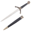 The dagger continues with a black textured handle. Raised lines crisscross along the grip to make it easier to grasp. The handle ends with a gold-colored zinc-alloy pommel. The circular pommel features a triskele design. Finally, this dagger comes with a black scabbard. It also features crossing lines as well as a gold-colored chape and throat. Knotwork patterns adorn the chape and throat. The Gold Celtic Knot Dagger makes a great addition to a weaponry display or collection.