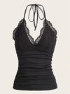 Add a touch of sensuality to your streetwear with our Goth Grunge Punk Black Lace Patchwork Halter Top. The solid color and ruched backless design give it an edgy look, perfect for a summer day. The halter top style is flattering and comfortable, making it a versatile addition to your Y2K wardrobe.