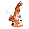 The Haunted Gourd Dab Rig is made of borosilicate glass with 3D sculpted enamel on the outside that is UV reactive. It pictures a skeleton that has risen from a grave with an orange pumpkin background. Inside, a circular percolator provides ample water filtration as you inhale. Each dab rig includes a 14mm male quartz banger.