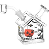 The Haunted House Dab Rig is made from clear borosilicate glass with Halloween-themed decal decorations. Vapors flow through the fixed stem into the Jack-O-Lantern percolator for a bit of cooling as you inhale. The angled stem keeps your face away from the hot banger and is also styled like the house's chimney. Each dab rig includes a 14mm male quartz banger.