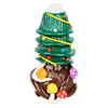The Holiday Shroom Tree Hand Pipe is made of borosilicate glass with 3D sculpted enamel on the outside that has glow in the dark accents. It is decorated with a tree covered in ornaments, ribbons, and mushrooms sprouting around the base. A carb hole is built into the left side of the bowl.