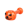 The Jack-O-Lantern Spoon Pipe is made from opaque orange borosilicate glass. Its spoon style body has a a flattened bowl base to prevent rolling or tipping. The front displays a grinning Jack-O-Lantern face decoration while a built-in carb hole is on the left side.
