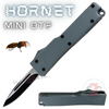 California Legal OTF (out-the-front) Automatic Knife, Gray drop point switchblade. D/A Hornet, small fun little key chain knives. Features a durable construction aluminum alloy handle with finger grip on the spine and belly. Spine Switch with a dual action opening and closing push button. Comes with a 2-toned Single Edge stainless steel blade!