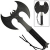 Constructed from a single piece of 440 black anodize stainless steel, a unique midnight design in the center of the blade adds to the appeal of this axe. The handle features a black nylon cord for a more comfortable grip and firm hold. The double bit allows you to keep swinging your axe without having to change your grip, the axe is perfectly balanced for a more accurate throw. Included is a black nylon sheath with steel snap fittings and belt loop.