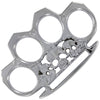 This piece makes a perfect paperweight in the office or around the house. Screw in the buckle pin and transform this knuckle into a buckle. It features four finger holes with a rectangle design on the front which will leave a lasting impression. It is silver color finish with large finger holes measuring approximately .75 in width and 1 in length.