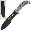The Living Dead Hollow Abyss Apocalyptic Hunting Knife has an ABS handle with grey and white skulls and green eyes along with claw marks.  The backside of the handle sports a Zombie Outbreak Response Team emblem with bio-hazard symbol.  Made of stainless steel construction with a black anodize finish for durability and to protect your blade from rust.  This unique style of blade with the partial serration will strike fear in the hearts of even the heartless. Living Dead Apocalypse is featured on the blade to add a little flair.  With this formidable weapon you can slice, dice and saw your way through a Zombie attack.  Included is a durable nylon sheath with a pocket for a sharpening stone or other supplies.