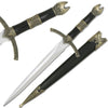 13 1/2" Overall. This LOTR medieval dagger features a stainless steel blade with cast metal furnishings on the handle and scabbard.