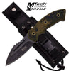 The M-Tech Xtreme Scout Master is a fixed blade knife that has full tang, solid construction making it a good, reliable tactical choice. The stainless steel, drop point blade has a black stonewash finish with a saw back. The handle is made of green camo textured G-10 with a lanyard hole. This also includes a black nylon belt sheath with a front utility pocket and a black lanyard cord.