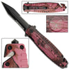 Equipped with useful tools to get you out of whatever predicament you might find yourself in, the razor sharp blade on this pocket knife makes it one of the very best knives you can carry. With a powder coated black finish and piercing spear point tip, the serrated blade is ready for action. Textured to provide a solid grip in hand, the industrial strength aluminum handle features a pink camo finish with steel bolsters and bolster lining providing strength and support for rugged everyday use. A sturdy engineered steel pocket clip assures the knife will never be far from your side and readily available for use whenever you need it while the rope cutter and glass breaker on the tip should prove quite useful.