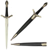 The Magical Cursed Blade Dagger makes an excellent example with its decorative details. This stainless steel knife has been given a mirror finish to make it gleam in the light. It displays a metal guard and black plastic handle, as well. Its guard and accompanying black sheath.