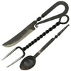 Hand forged from stainless steel and given a blackened antique finish for an authentic look, this cutlery set includes a knife, fork and spoon to give you everything you need for a taste of authentic medieval camp life. The three utensils each feature little elegant twist designs in their grip, adding a fine touch of detail to their design. The knife has a short drop point blade with a curved edge and a fine point, a curled over handle provides a wider grip. The fork features two tines, like the traditional carving fork, and both the fork and the spoon feature straight grips that end in little curled hooks for easy and convenient storage when they are not in use.