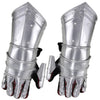 Historically, gauntlets were used by soldiers and knights. It was considered an important piece of armor, since the hands and arms were particularly vulnerable in hand-to-hand combat. These gauntlets are 18g plate armor with a polished finish. Each section has been riveted together for securing the plates but leaving optimal mobility. They cover the back of the fingers, hands, and most of the forearm. Both hands fit into black suede gloves that come in size large. They feature patches of red leather that has been hand sewn to the top of the gloves on each figure. These gloves are great for re-enactments with light sparring or finishing off a costume.