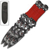Bearing fierce deadly skulls, these dynamic throwing knives are aerodynamically sound and will literally tear through the air. With piercing dagger point tips, each perfectly balanced knife is solidly built and is well constructed with 3 weight reducing circular cutouts running down the center of the blade and two menacing faces staring back at you. Shipping factory sharp, the 5 inch blades have a stylish skull skin finish for a unique look as well as to prolong the life of the blade. To add a pop of color the handle is wrapped with a red nylon cord for a more comfortable grip. Included is a FREE 3 compartment nylon sheath.