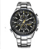 Specifications: • Movement: Quartz • Battery Included: Yes • Case Material: Stainless Steel • Case Shape: Round • Case Diameter: 3.9 cm • Case Thickness: 1.33 cm • Dial Diameter: 3.5–3.9 cm • Dial Window Material: Hardlex • Color: Black (steel strip) • Band Material: Stainless Steel • Band Width: 1–1.4 cm • Band Length: 45.5 cm • Clasp Type: Bracelet Clasp • Water Resistance Depth: 3 Bar (Life Waterproof) • Features: Complete Calendar • Style: Simple • For: Men • Included: Gift Box • Model: Blue Angel
