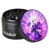 The Tophatter's Inc. Metal Herb Grinder comes apart into four separate pieces, including a sifting screen that leads to a pollen chamber. Magnetic lid closure ensures the contents stay safely secured. The Flowering design depicts a detailed close-up of a purple bud covered in hairs.