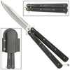 Sporting a silver clip point blade, the slim build and good weight of this balisong butterfly knife delivers nice action in an attractive package. The distinctive Micarta construction handle is decorated with an attractive black and grey wooden pattern which is attached to the steel inner framing with a torque screw. A metal safety latch is included to lock the blade into place when it is not in use as well as when it is deployed. The blade offers blood grooves on both sides allowing for a more balanced blade. This Black Micarta handle knife comes complete with a durable hard cover sheath which clips onto your belt or can be fastened through your belt.