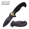 It features a gold colored Death Skull over the main pivot screw. Perfect and handy for everyday use. Built using only high quality materials. Be the first in your area to have this exclusive knife with lightning fast assisted opening action. The blade is stainless steel with a black finish. It's plain edged and comes factory sharp. On the front side it has Midnight Ops - Stealth Tactics Guts and the MTech Ballistic logo. To open, there's a thumb spur and it's liner locking. The handle is aluminum with a stainless steel inner frame and a textured ABS center overlay. All black with the gold colored skull bolster. For carrying, the back side has a 2 1/2" Pocket Gear Clip.