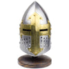 The Miniature Brass Crusader Helmet is hand crafted and made of 20g steel. This miniature helmet has the characteristic all around and would make an ideal decoration for your desk, mantel or cabinet. Includes a display stand.
