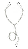 Measurements: 24.5 inches in total length, nipple chain measures 18 inches in length, clit chain measures 15.5 inches in length. Clamps open up to 1 inch in width and close completely Material: Metal, vinyl. Color: Silver.