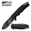 The M-Tech Ballistic Serf Black Stripes is a spring assisted knife. With its compact size it's the perfect knife to carry everyday. This tiger stripe finished, stainless steel blade has partially serrated edge. This clip point style knife has a flipper and thumb stud opener. The handle is an all black aluminum that includes a glass breaker. Carry this with the black pocket clip.