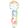 The Neon Candy Cane Spoon Pipe is made from clear borosilicate glass with a classic spoon style body. 3D enamel decorations adorn the outside in colorful candy canes that glow in the dark. A carb hole is built into the left side of the bowl.