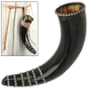 Decorated with attractive metallic studs embedded within grooves carved into the horns surface, this deluxe drinking horn is made from 100% pure cow horn and holds approximately 8-15 oz of water, wine, ale, beer, or other drink. The exterior is polished to a shiny surface while the interior is boiling water proof. Horns from cows, buffalo or oxen have traditionally been used as drinking vessels by various people in many regions of the world, this fine specimen is a great example of the practice.