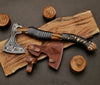 The carbon steel blade of this axe has both a polished as well as rough textured finish, and features traditional Viking style motifs. The squared butt of the axe head is suitable for hammering or bashing. The handle has been heat treated to bring out the gorgeous natural layering of the sheesham wood. Genuine leather is wrapped around the handle. This axe is well balanced and ready for hard work; however, you may be more enticed to hang it on your wall for some awesome home décor. Comes complete with a complimentary sheath made from quality genuine rich brown leather, and has snap closures as well as a belt loop for hands-free carry.