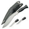 While the Gurkha kukri is the traditional utility knife of the Nepalese people, it is also often used by high-ranking military officials and police officers. The Ornate Gurkha Service Kukri offers an elegant version of this weapon. This stunning knife is crafted from gleaming stainless steel with a satin finish. The dark gray handle of the knife features a unique shape, offering a distinct look while still feeling comfortable in your hand. Included with the kukri are two smaller knives, as well as a stylishly designed dark gray sheath with striking engraved steel fittings.