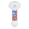 Light up the night with a few puffs from the Patriotic Leaf Glow Spoon Pipe! Made from borosilicate glass, this hand pipe's stem is wrapped with red and white stripes, complemented with blue accents and weed leaves that glow in the dark! The rounded bowl end also has a coordinating patriotic leafy decal for decoration. Spoon pipes are a classic in the stoner community because they're simple to use and easy to stash.