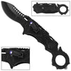 This knife features a unique handle style with a black finish and a black 440 stainless steel blade. The drop point style blade provides more control and adds strength to the tip extra cutting edge. A thumb stud and flicker on the blade gives you two options for easy deployment. The spring assisted blade deploys swiftly and is razor sharp, the aluminum handle has a large ring hole on the pommel to help secure the knife in your hand when using. Police is screened on the handle because we constructed this blade to honor the Men and Women who put their life on the line day in and day out to protect us from ourselves and others. The end of the handle features a glass breaker and a seat belt cutter in case of emergencies. As an added bonus this knife is also equipped with a flashlight. The handle is double wall reinforced and houses the liner locking mechanism to lock the blade in place. The spine offers thumb ridges for extra support and comes equipped with a solid steel black anodize pocket clip. This blade meets more needs that your standard knife. Great for hiking, camping, and emergency situations.