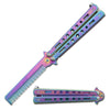 Master your butterfly knife skills with this titanium rainbow finish butterfly comb trainer blades! This trainer looks and feels just like a real butterfly knife with an unsharpened, false edge blade. The entire trainer is constructed of stainless steel with an anodized finish.