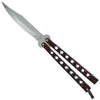 These butterfly knives are high quality! They feature a nice polished finished scimitar style stainless steel blade, plain edge. The red crackle patterned handle features a skeleton-like design for light weight. Easy action and good weight overall. These are great for learning or for a collection.