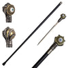 The cane shaft has been constructed from steel with a black glossy finish. Hidden inside of the black metal shaft is a 12” hidden blade made of stainless steel, which can be accessed by unscrewing the handle. The bottom of the cane features a tough rubber gripper. The head of the cane has been constructed from steel with Rolling Evil Eye With Skeletal Hand Handle.